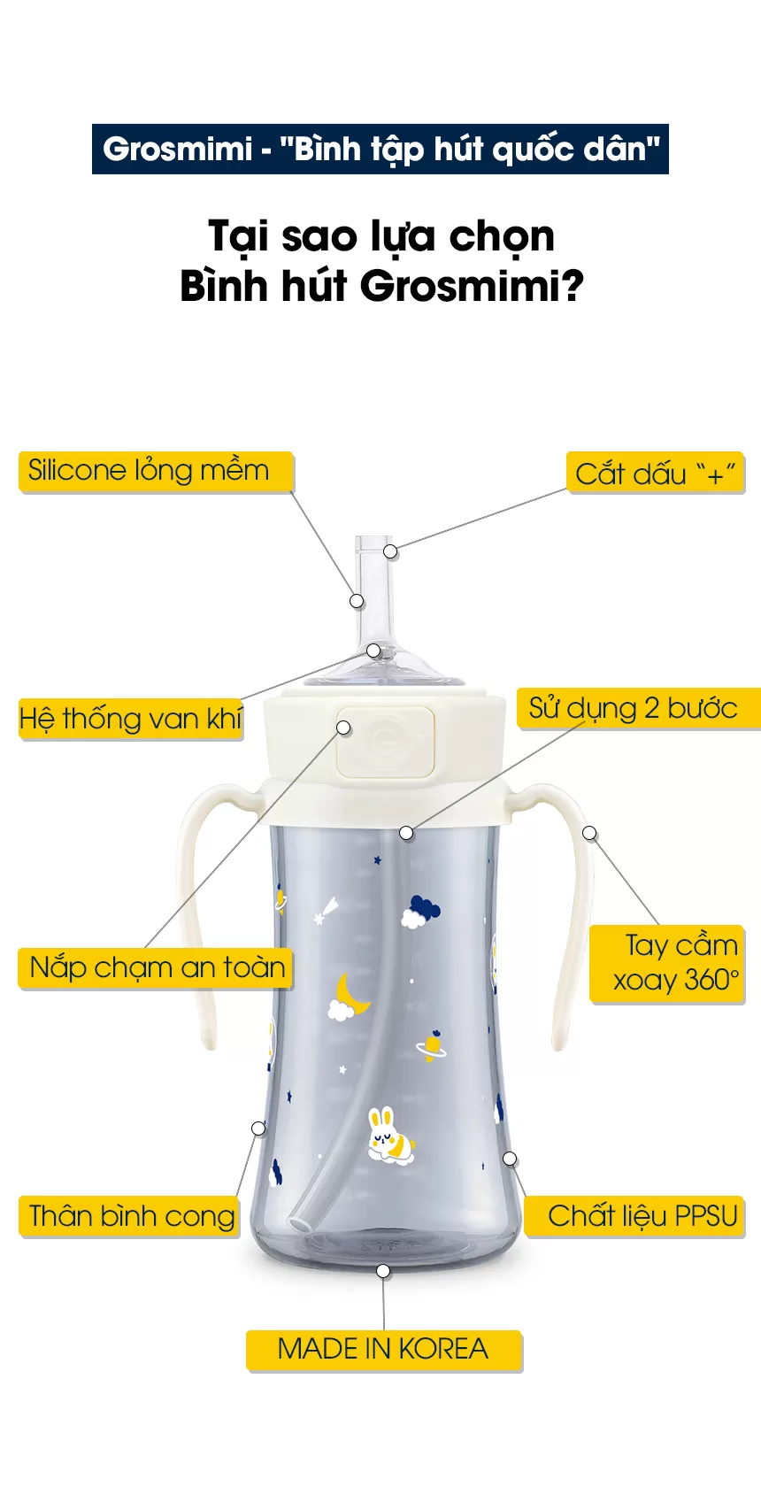 Bình ống hút xanh kem PPSU Bé thỏ ngân hà 200ml nắp an toàn một chạm