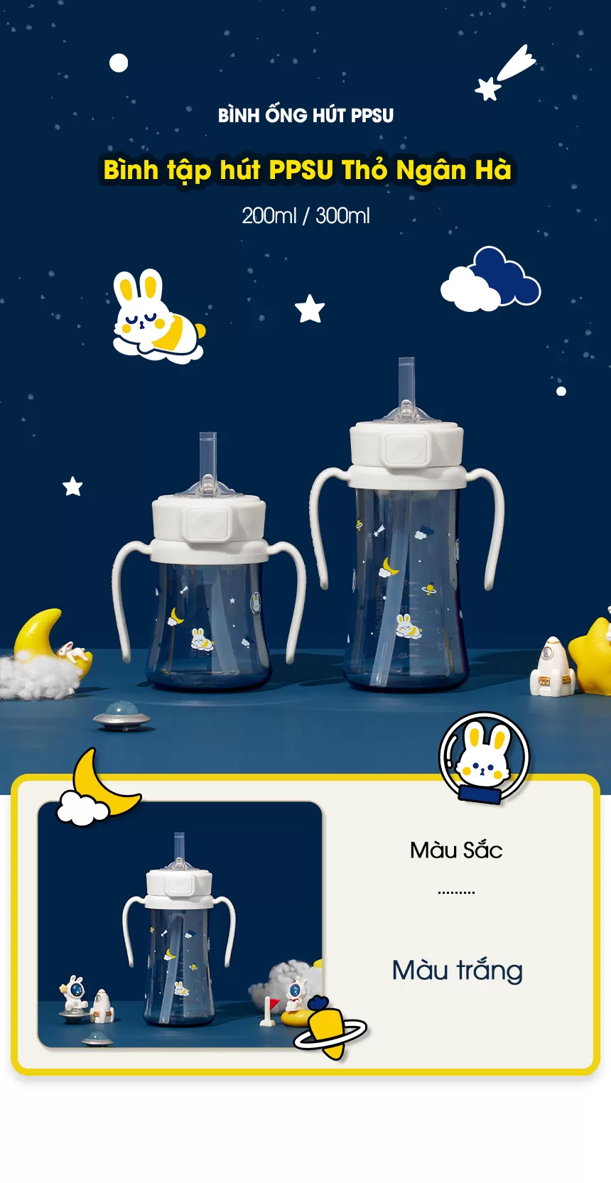 Bình ống hút xanh kem PPSU Bé thỏ ngân hà 300ml nắp an toàn một chạm